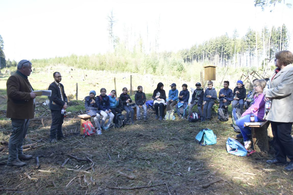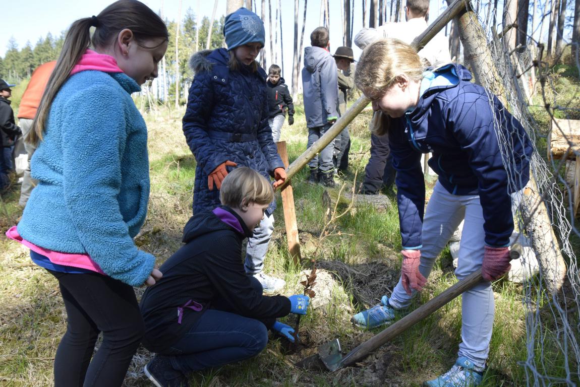 Auch die Buben ein paar Meter weiter sind froh, dass ihnen einer der Waldarbeiter hilft. Sebastian Rogg weiß auch, warum es so schwer geht: „Die Erde ist hart. Darunter sind dann noch Steine und Wurzeln.“ Als das Loch für die Wurzeln der kleinen Rotbuchen oder Buchen groß genug ist, setzen sie den kleinen Baum schnell hinein, geben mit den Fingern die Erde über die Wurzeln und treten zum Abschluss die Erde fest.