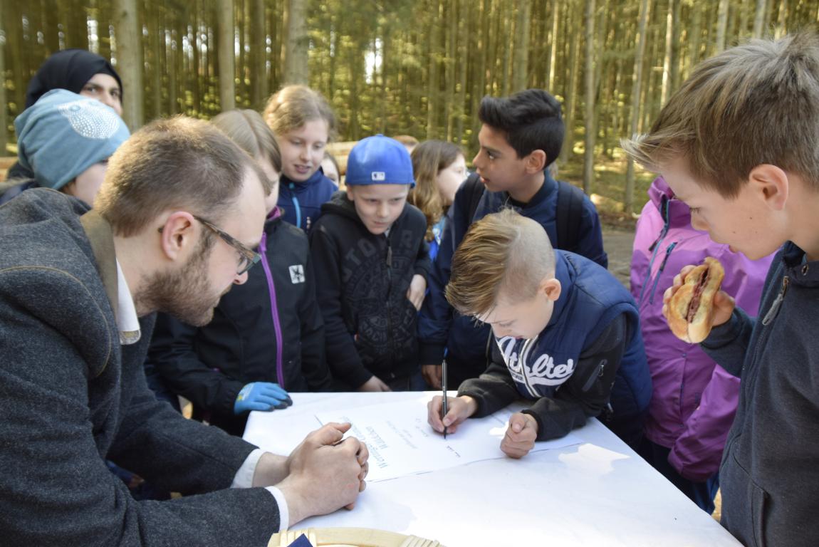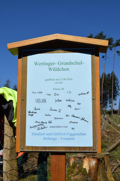 Weiter geht’s zum nächsten Baum. Fabian Schäble und Bilal Temizyürik erzählen, dass sie daheim schon mal mitgeholfen haben, einen Baum zu pflanzen. Begeistert machen sie weiter. Mit ihrer Lehrerin Margarethe Zikeli waren die 20 Mädchen und Buben der Klasse 4b der Grundschule Wertingen in den Fuggerschen Stiftungswald bei Emersacker gefahren. In die Abteilung „Großkopf“, wo jetzt das „Wertinger Grundschulwäldchen“ zu finden ist. Auf einem Schild haben alle Schüler unterschrieben - auch Kay Dafler aus Rain am Lech. Er vertritt die Organisation „Plant-for-the-planet“. Hier engagieren sich Kinder, welche die Klimakrise durch das Pflanzen von Bäumen stoppen wollen. „Ihr könntet auch mitmachen und als Botschafter unterwegs sein“, erklärt Kay den Viertklässlern. Im November, bei der Vergabe des Fugger-Wissenschaftspreises in Augsburg, nahm die Festrednerin Clara Slawik den Organisatoren das Versprechen ab, einen Baum zu pflanzen. Sie engagiert sich ebenfalls für „Plant-for-the-planet“. Doch die Fuggerschen Stiftungen beließen es nicht bei einem Baum, sondern pflanzten anlässlich des Tags des Baumes am 25. April mit den Wertinger Viertklässlern gleich ein ganzes Wäldchen mit 1000 Bäumen. Eben das „Wertinger Grundschulwäldchen“. Johannes Mayer, der seit März als Nachfolger des Revierförsters Gerhard Hübner eingearbeitet wird, hat die Aktion vorbereitet. Dabei betreute jeweils ein Mitarbeiter eine kleine Gruppe mit drei oder vier Kindern. „Nicht nur die Qualität der Pflanzen muss stimmen, sie müssen auch fachgerecht eingepflanzt werden“, steht für Forstdirektor Dauner außer Frage. Denn aus dem vorherigen Fichtenbestand soll ein stabiler Mischwald werden. Wolf-Dietrich Graf von Hundt, Administrator der Fürstlich und Gräflich Fuggerschen Stiftungen, freut sich über die Begeisterung der Neun- bis Zehnjährigen und betont: „Das ist die beste Art, Kinder an die Natur heranzubringen.“ Forstdirektor Hartmut Dauner hat aber auch die Erfahrung gemacht: „Schüler vom Land sind in der Regel begeisterungsfähiger für den Wald als die aus der Stadt.“ Begeistert ist auf jeden Fall Clemens Fuhrer: „Hier muss man sich anstrengen und kann richtig arbeiten.“ Vor allem macht ihm Spaß, dass alle zusammenhelfen. „Wir sind die nächsten Förster“, sind sich Florian Jabs und Fabian Schalk mit Clemens einig. Sie haben die Bäume, die sie gepflanzt haben, mit Holzplatten markiert, erklären sie. Denn sie wollen schauen, was aus ihrem Wald wird. Vielleicht auch mal später mit ihren Kindern.