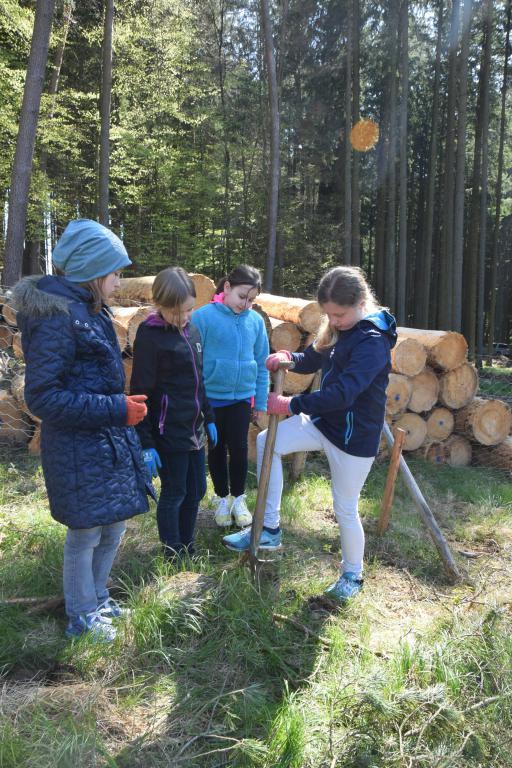 Ein Loch in den Waldboden zu stechen ist gar nicht so einfach. Das merkt Sofie Hohenreuther schnell, die zusammen mit Emmi Karl, Nadine Fußan und Lilly Holst ein Team bildet.