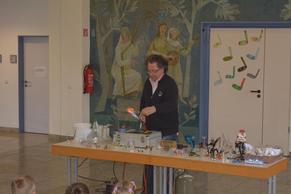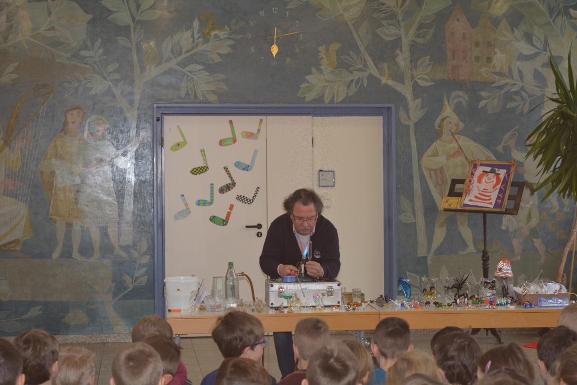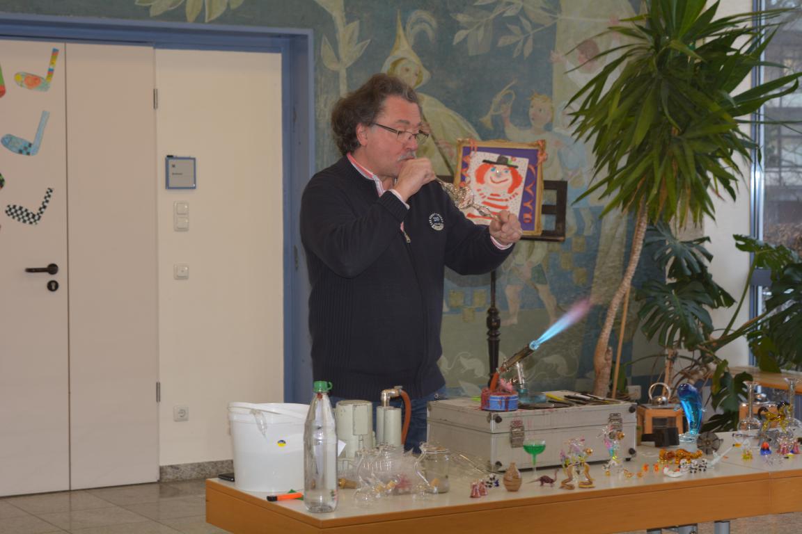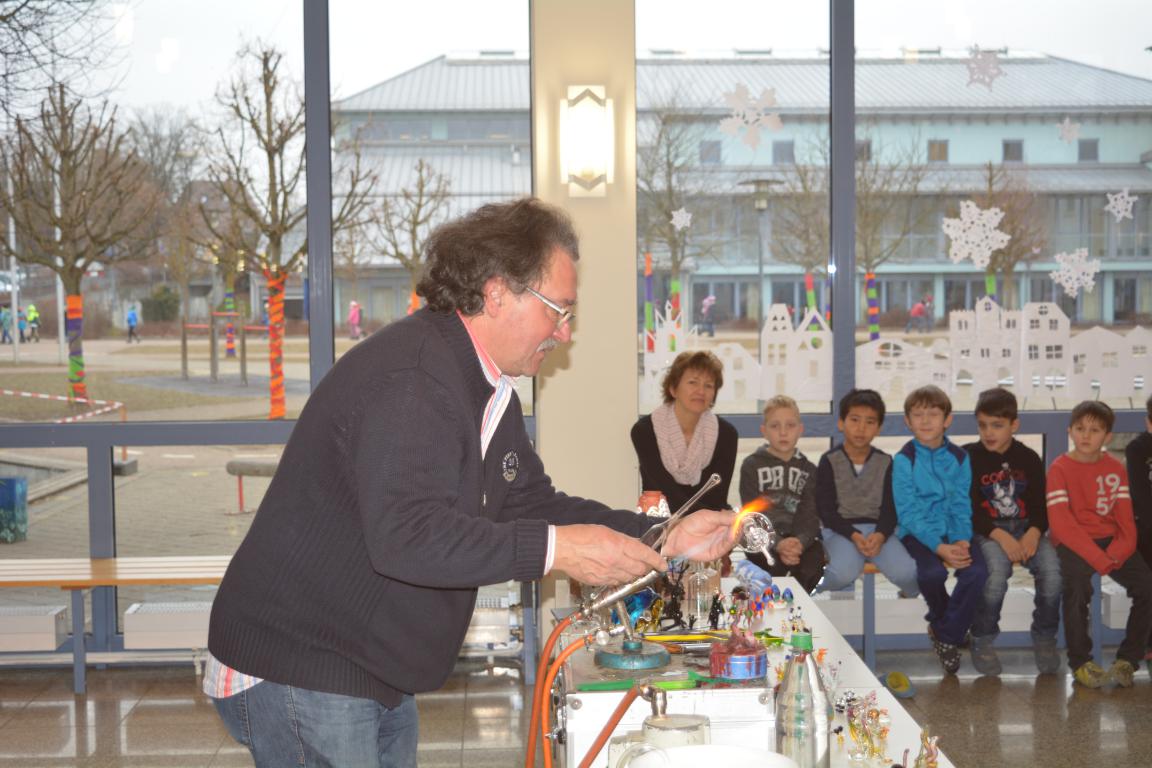 Spannung herrschte am vergangenen Donnerstag in der Aula der GS Wertingen, als der Glasbläser Herr Sommer seine Utensilien aufgebaut hatte, um etwas über seinen „heißen“ Beruf zu erzählen und in erste Geheimnisse des Glasblasens einzuweihen. In mehreren Vorstellungen gab er den ganzen Vormittag lang allen Schülern und ihren Lehrern einen unterhaltsamen und kurzweiligen Einblick in sein Handwerk.