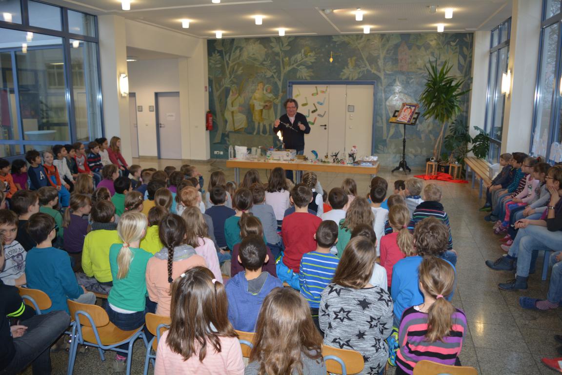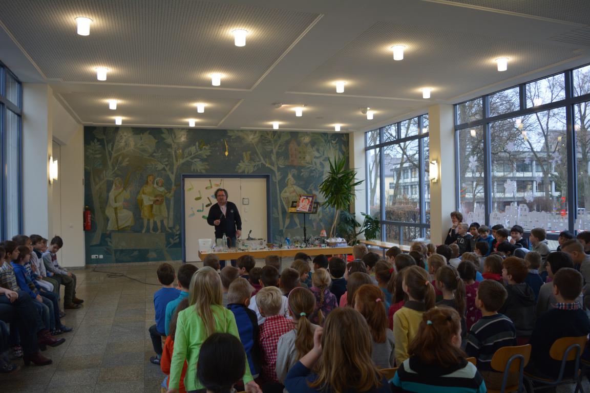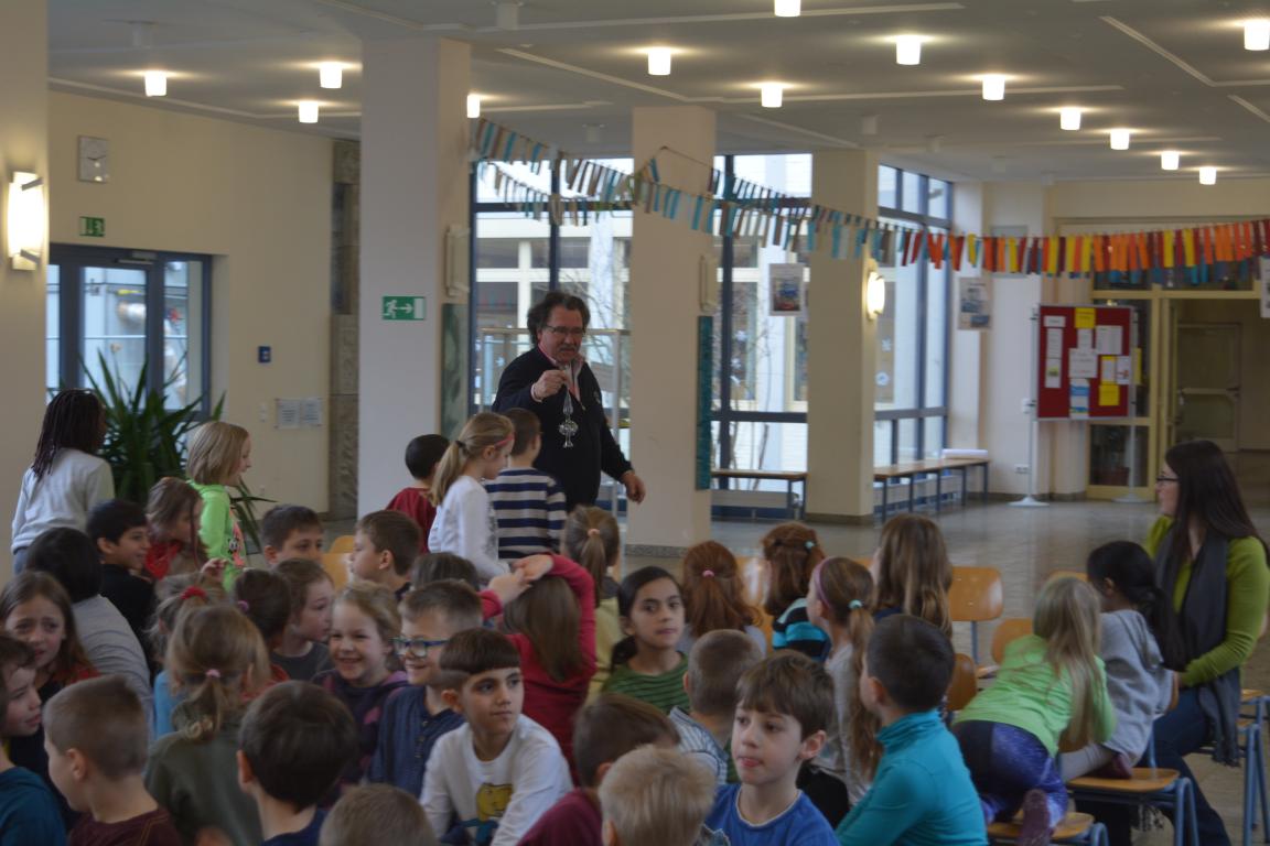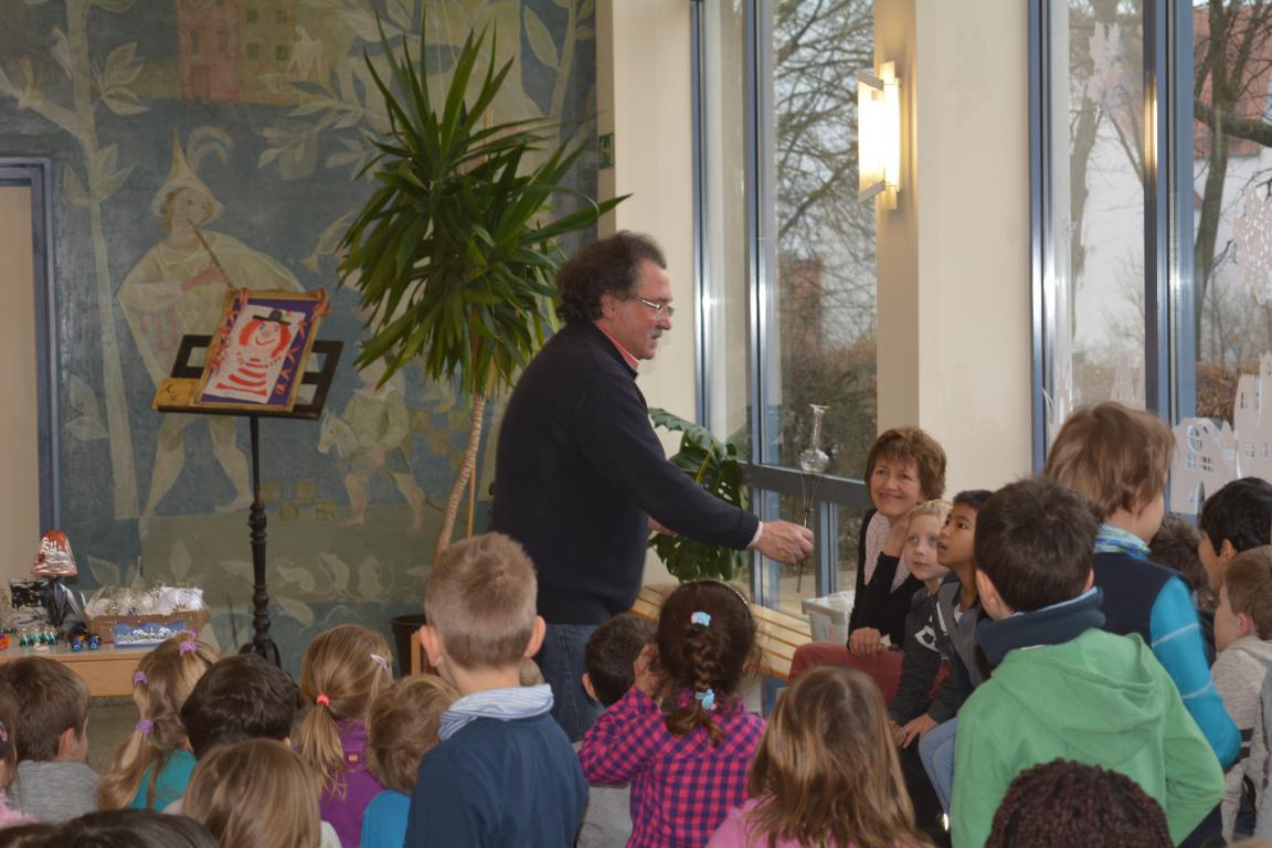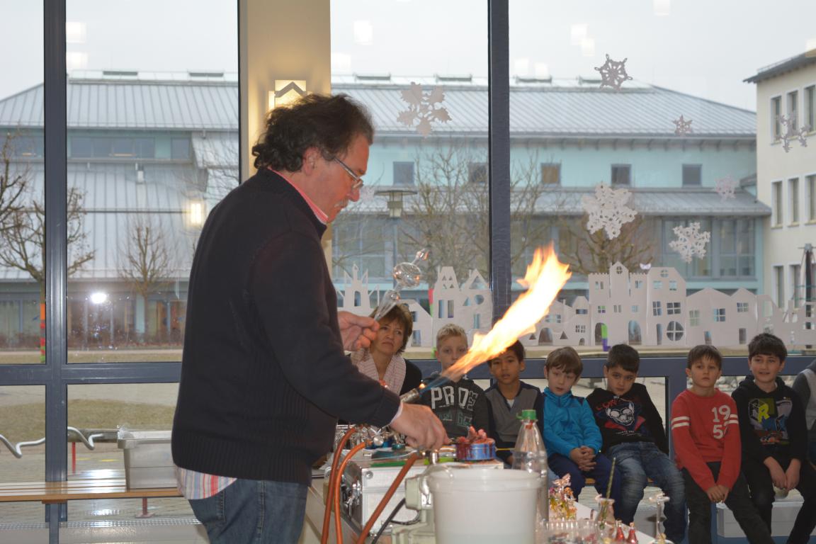 Spannung herrschte am vergangenen Donnerstag in der Aula der GS Wertingen, als der Glasbläser Herr Sommer seine Utensilien aufgebaut hatte, um etwas über seinen „heißen“ Beruf zu erzählen und in erste Geheimnisse des Glasblasens einzuweihen. In mehreren Vorstellungen gab er den ganzen Vormittag lang allen Schülern und ihren Lehrern einen unterhaltsamen und kurzweiligen Einblick in sein Handwerk.