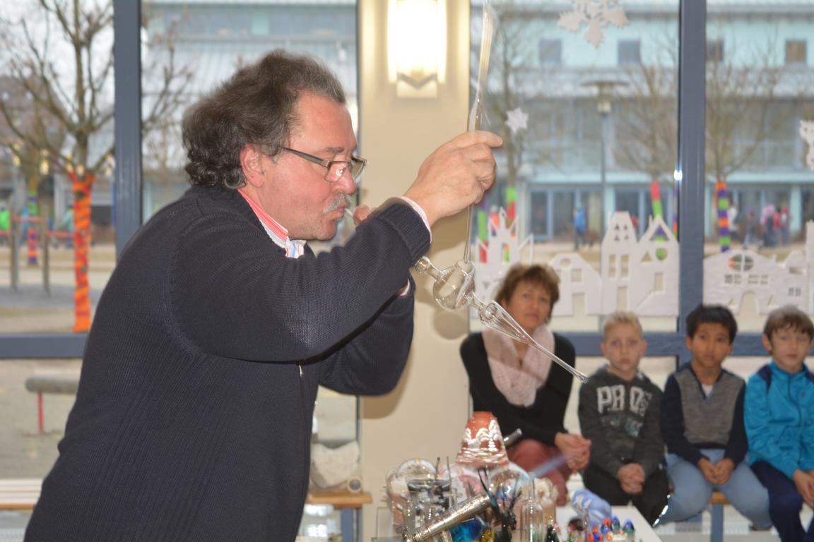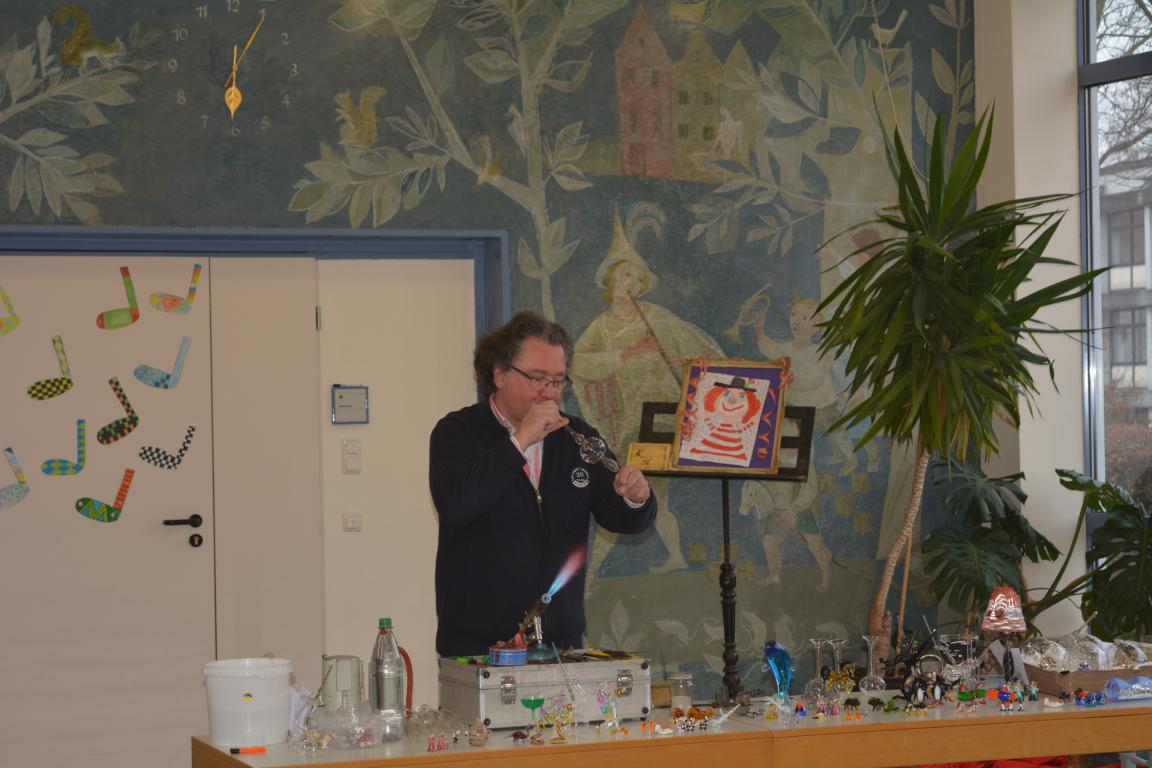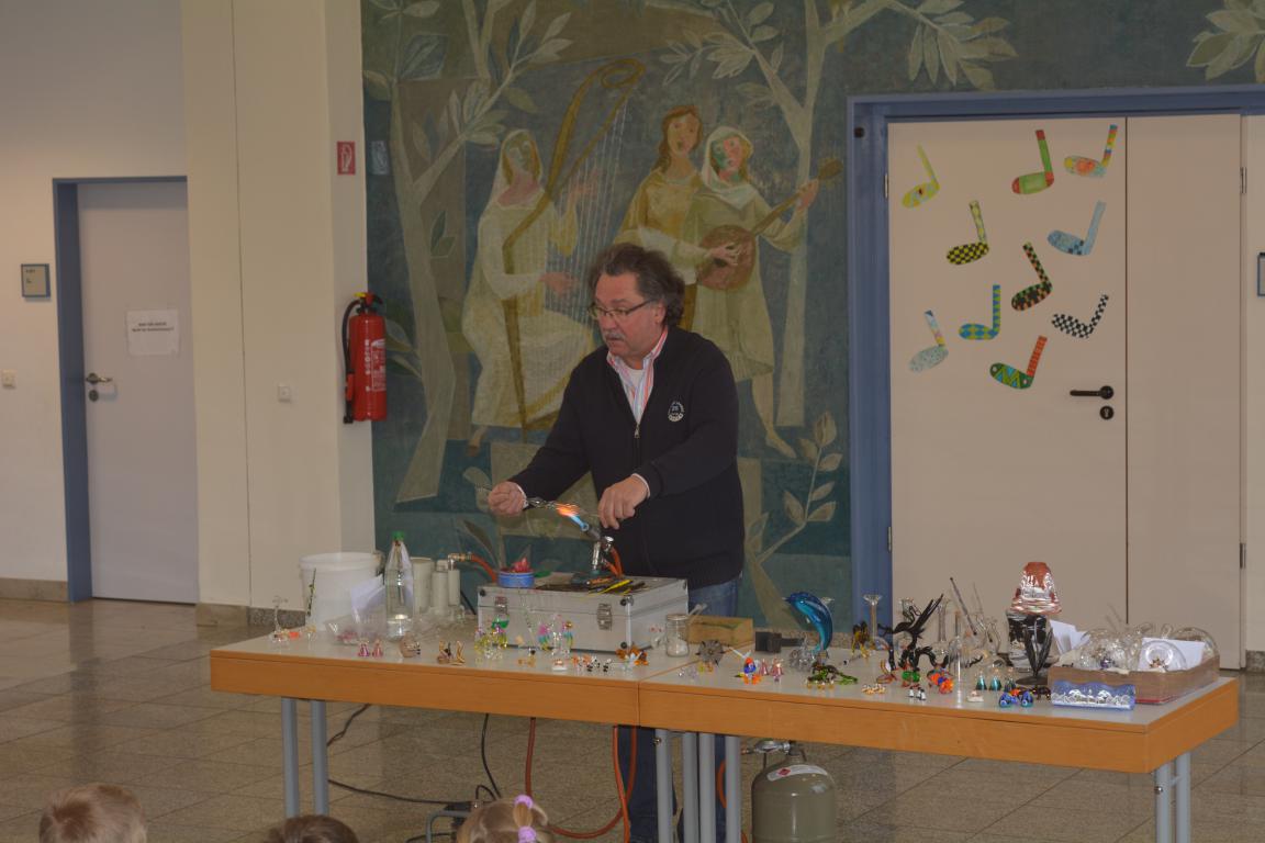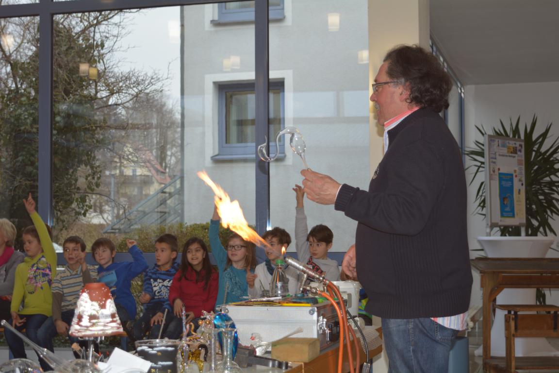 In der über tausend Grad heißen Flamme schmolz er Glaskolben und blies daraus eindrucksvolle Christbaumspitzen, Schwäne oder Blumenvasen. Dabei erklärte er den jungen Zuschauern auf humorige Art und Weise die einzelnen Schritte. Auch kleinere Arbeiten, die in seinem Familienbetrieb hergestellt werden, hatte er dabei. Ein gläserner Wasserteufel , der in einer Flasche auf Kommando hochsteigen oder nach unten fallen konnte, beeindruckte die Kinder so sehr, dass Herr Sommer ihnen das dahintersteckende physikalische Prinzip erklärte. Abschließend stellte er mit Hilfe zweier Kinder gläserne Scherzartikel vor.
