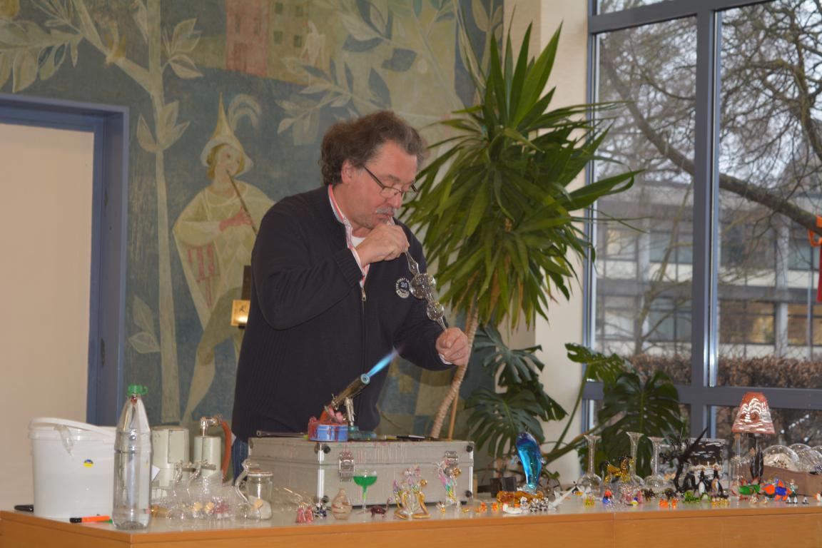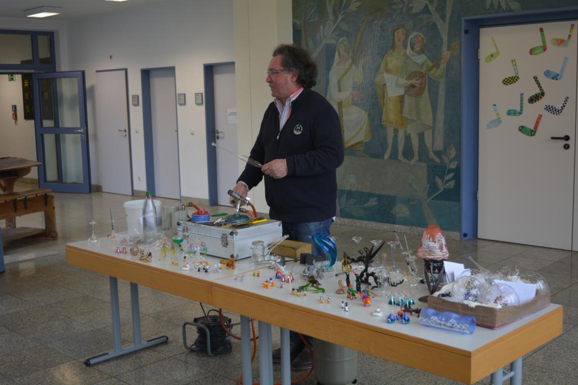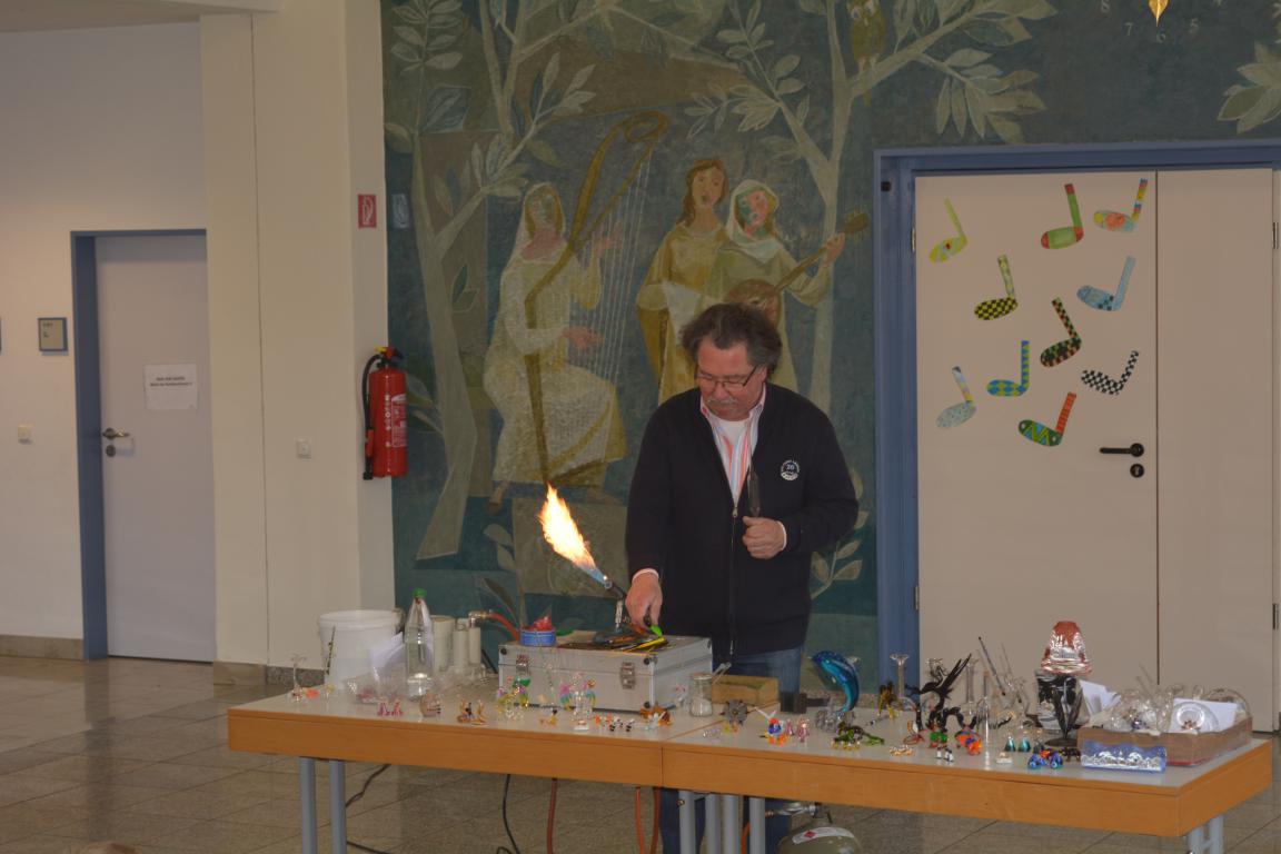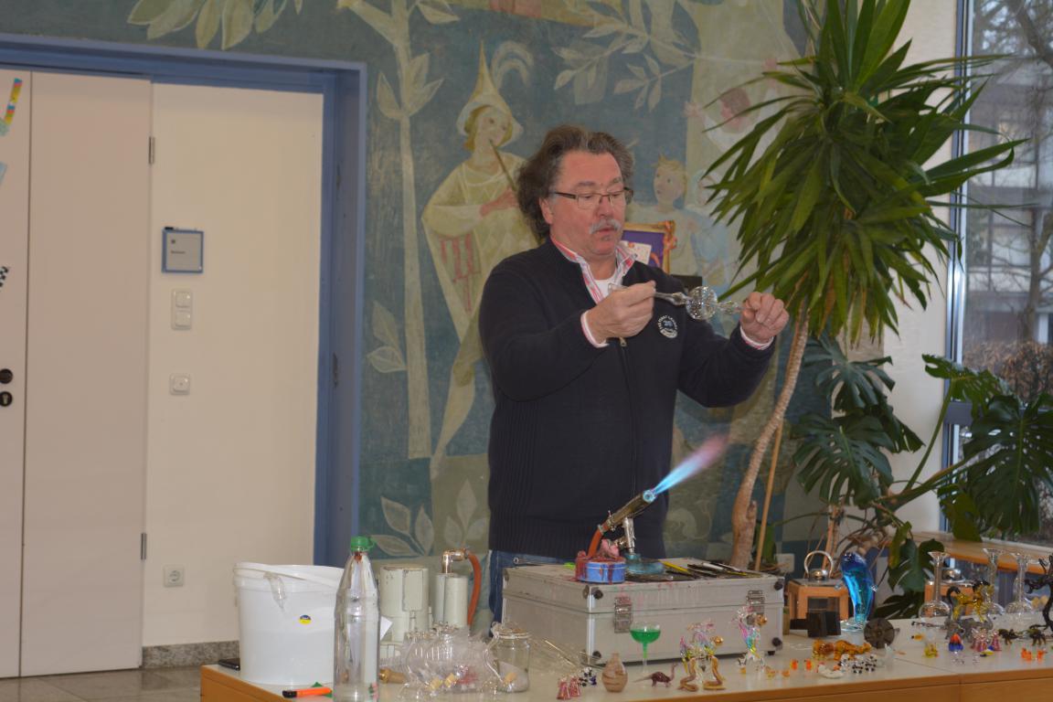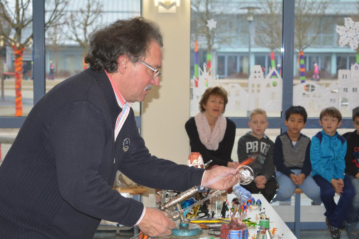 In der über tausend Grad heißen Flamme schmolz er Glaskolben und blies daraus eindrucksvolle Christbaumspitzen, Schwäne oder Blumenvasen. Dabei erklärte er den jungen Zuschauern auf humorige Art und Weise die einzelnen Schritte. Auch kleinere Arbeiten, die in seinem Familienbetrieb hergestellt werden, hatte er dabei. Ein gläserner Wasserteufel , der in einer Flasche auf Kommando hochsteigen oder nach unten fallen konnte, beeindruckte die Kinder so sehr, dass Herr Sommer ihnen das dahintersteckende physikalische Prinzip erklärte. Abschließend stellte er mit Hilfe zweier Kinder gläserne Scherzartikel vor.