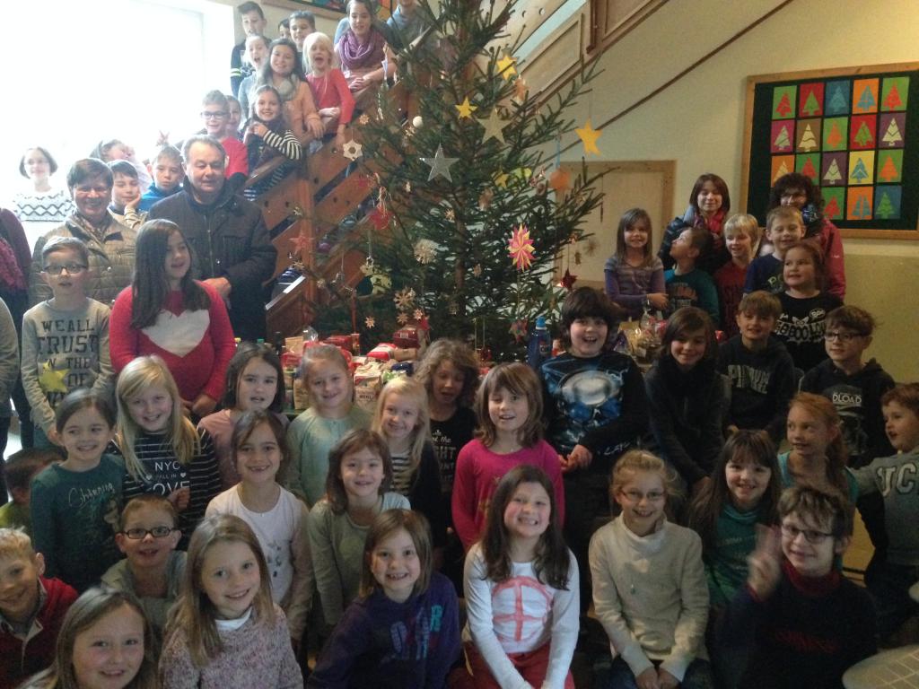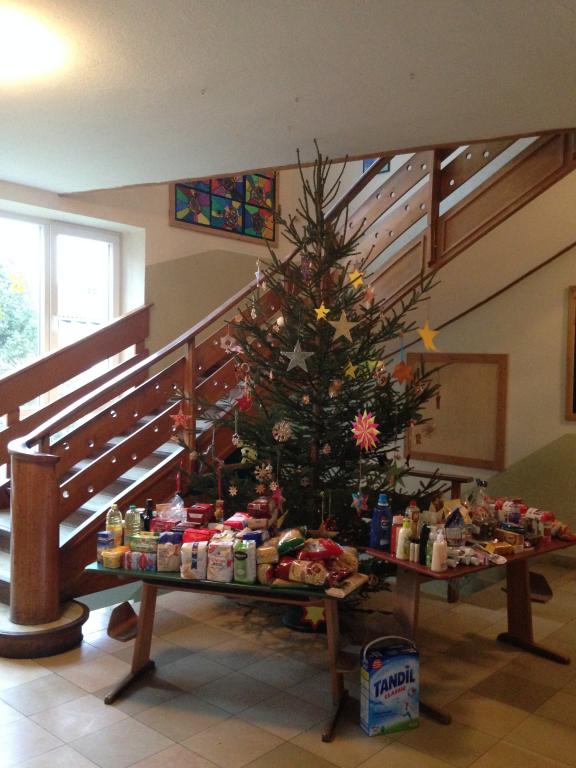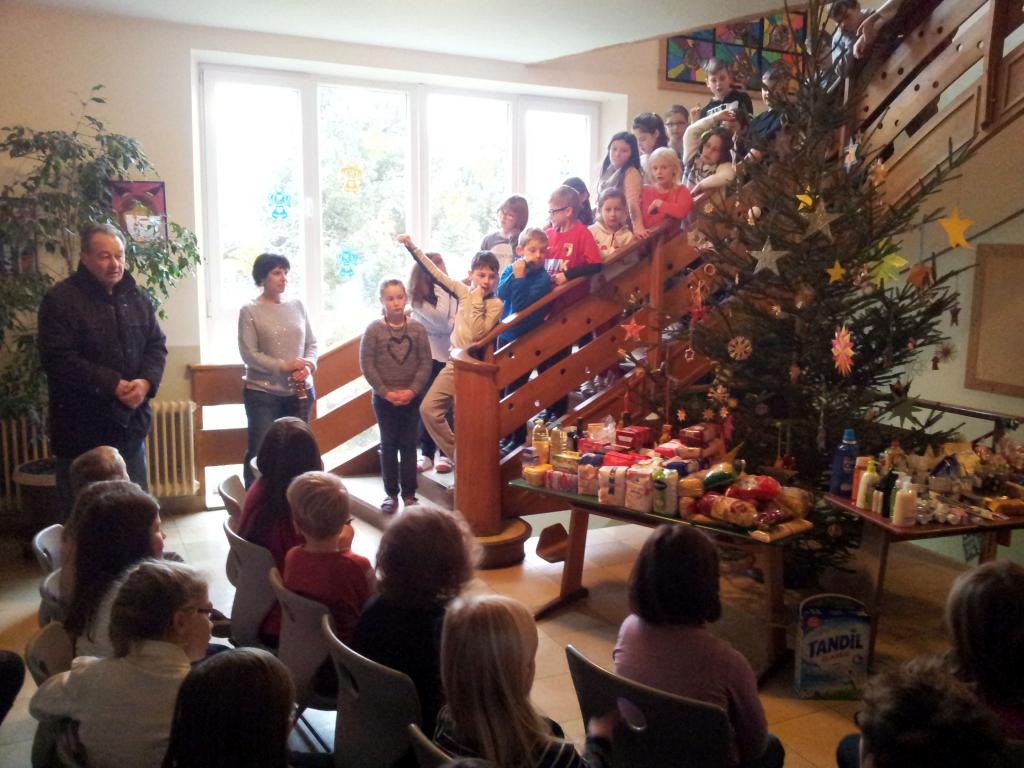 Am Montag, den 19. Dezember 2016 versammelten sich alle Schüler um den geschmückten Christbaum. Nun durften wir die Spenden den beiden ehrenamtlichen Helfern übergeben, die uns an der Außenstelle besuchten. |