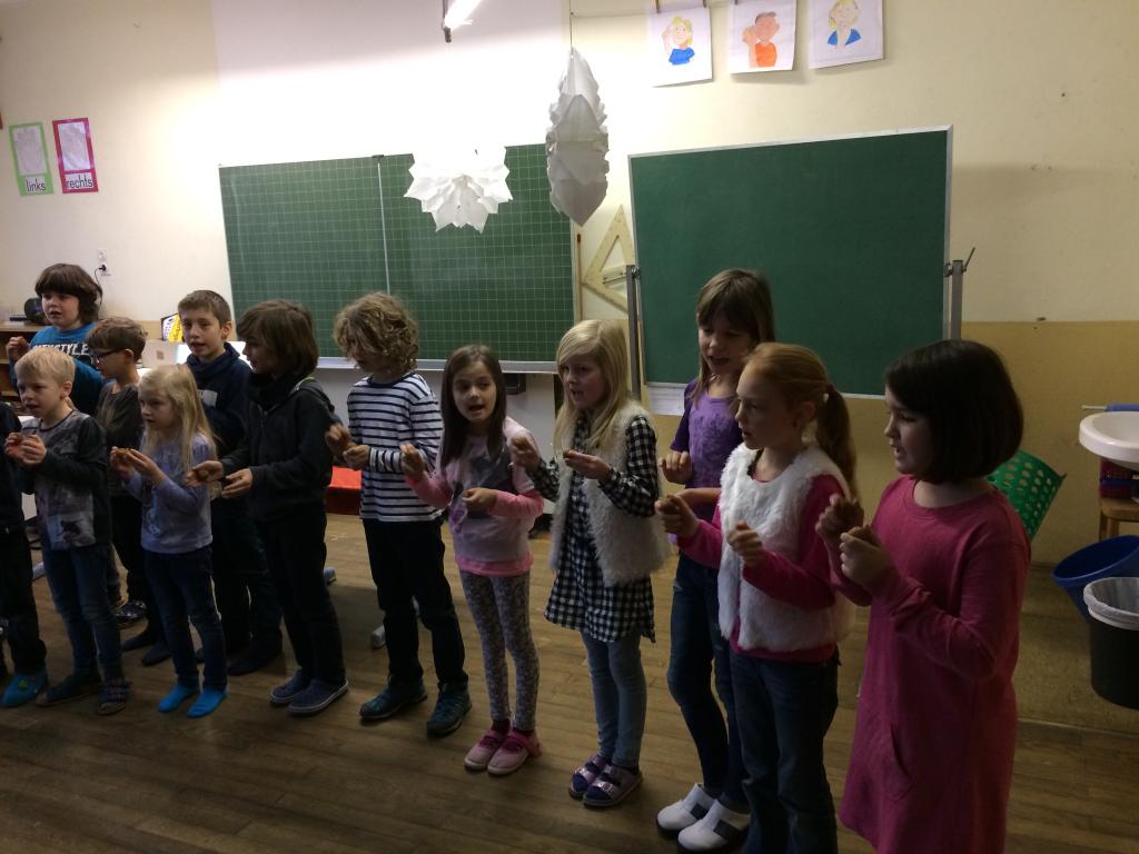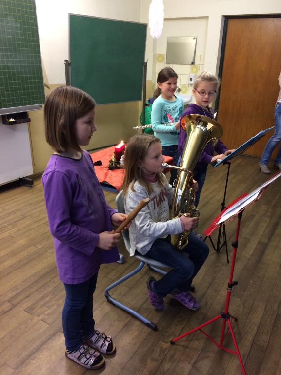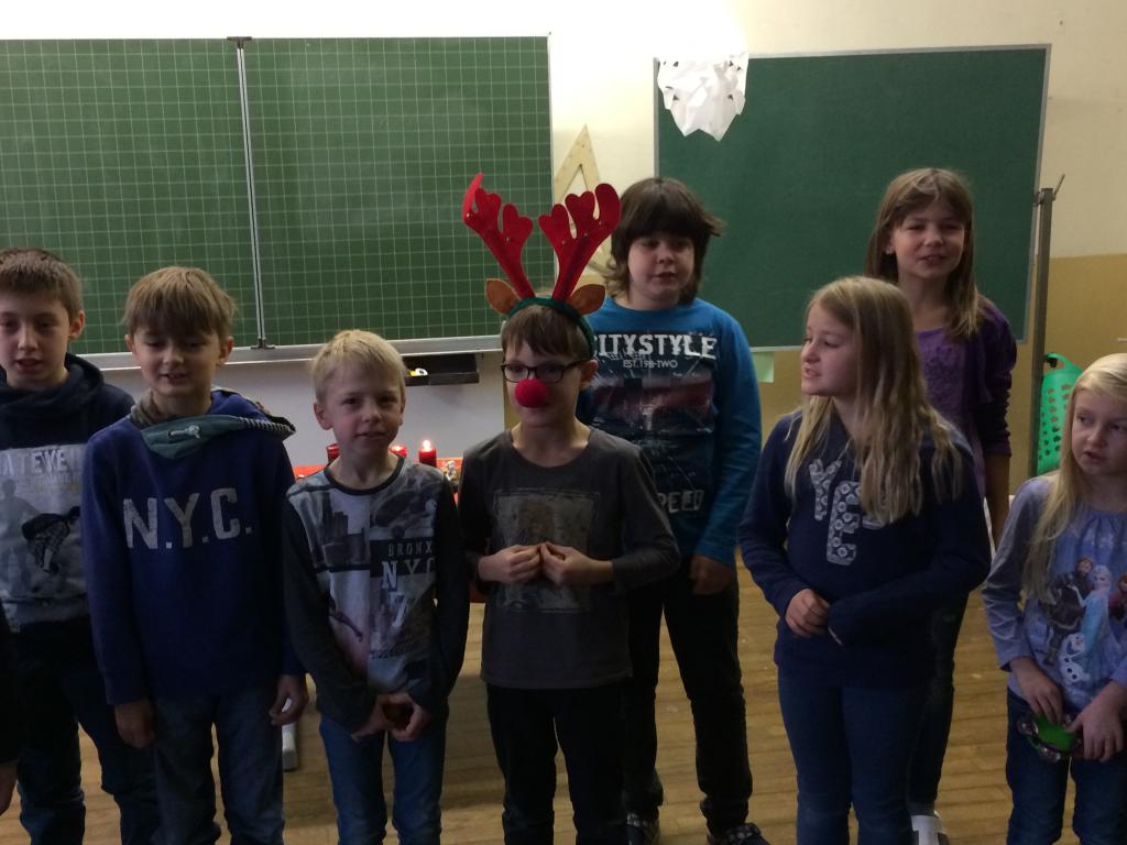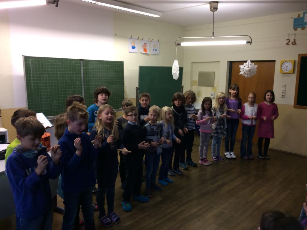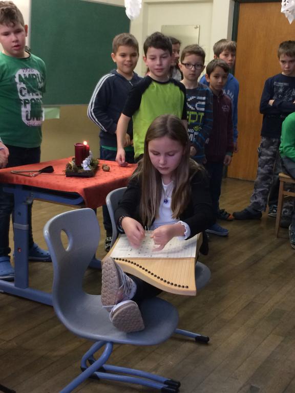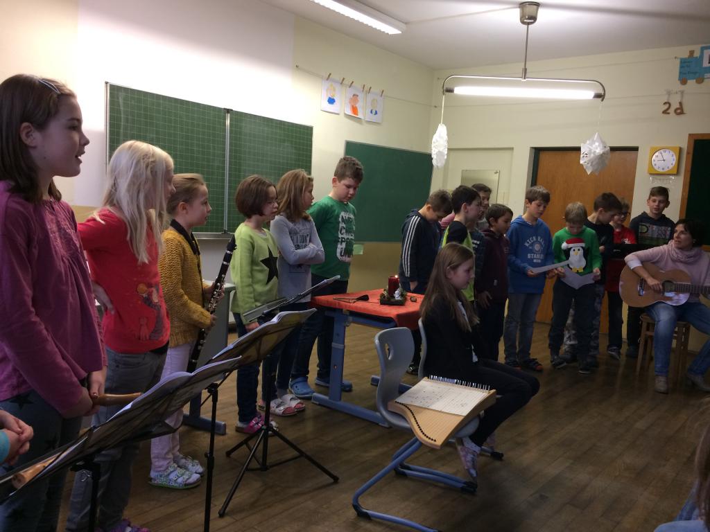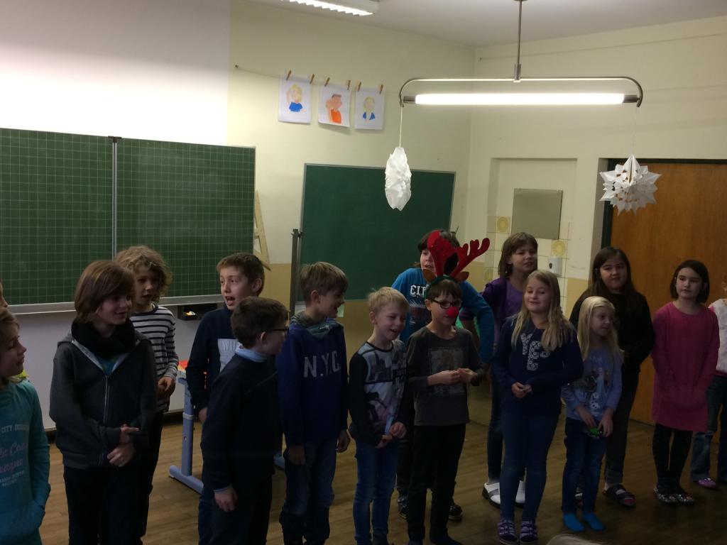 Im Advent wurde in den Klassen 2d, 3d und 4d eifrig auf die Weihnachtsfeier geprobt. Am letzten Schultag vor den Ferien war es dann endlich soweit: Alle Gottmannshofer Schüler und Lehrer trafen sich in einem Klassenzimmer und begannen die Feier mit dem gemeinsamen Lied „Wir sagen euch an“. Dann führte jede Klasse einige Stücke auf. Die Zweitklässler sangen z.B. „In der Weihnachtsbäckerei“ vor, die Kinder der 3d musizierten ein Nuss-Rondo und die Viertklässler zeigten einen weihnachtlichen Jodelsong. Außerdem hatten Schüler aus allen Klassen ihre Instrumente mitgebracht und spielten adventliche Lieder auf der Flöte, der Klarinette, der Querflöte usw. vor. Nachdem die Aufführung mit einem gemeinsamen Lied beendet wurde, gingen alle ins „Adventscafé“. Dort saßen Kinder und Lehrer noch ein wenig gemütlich beisammen und ließen sich Punsch und Plätzchen schmecken.