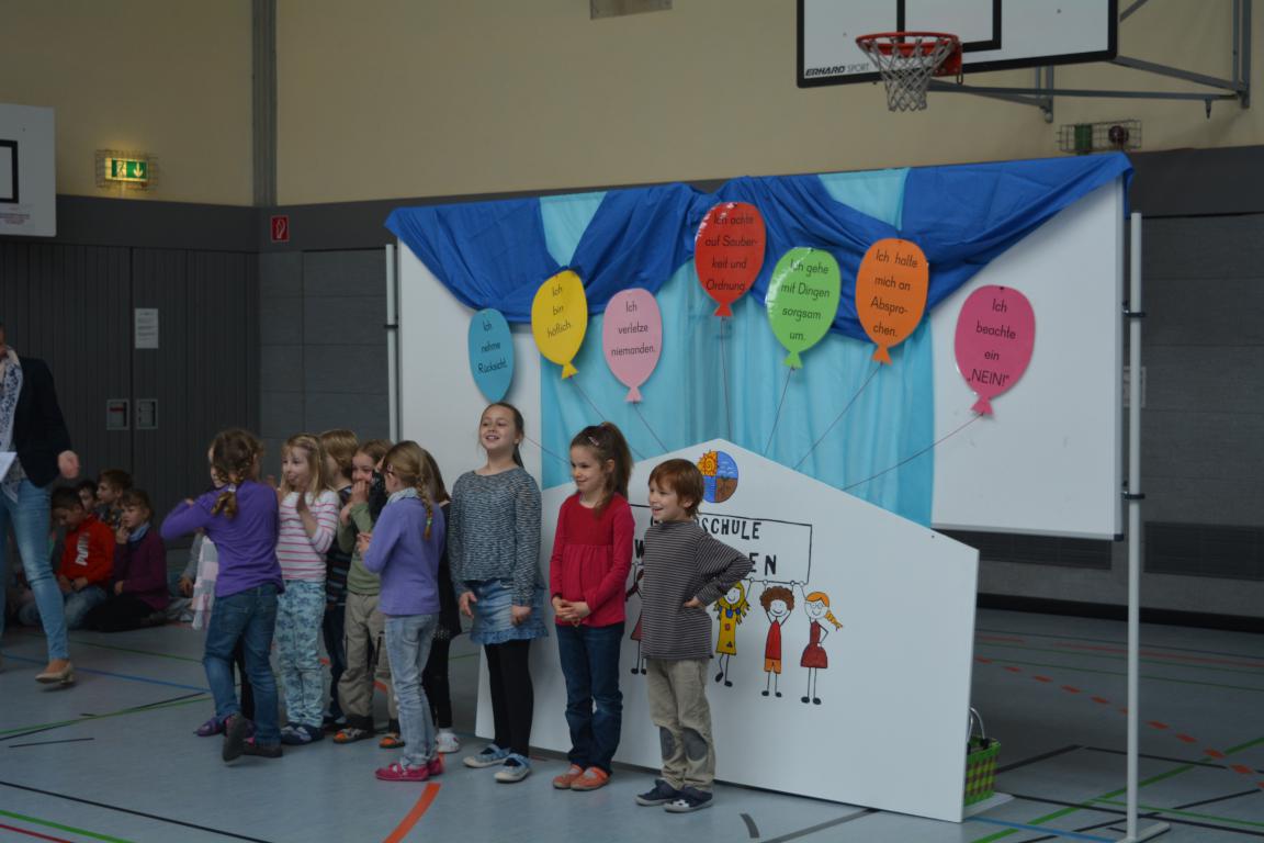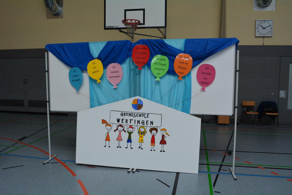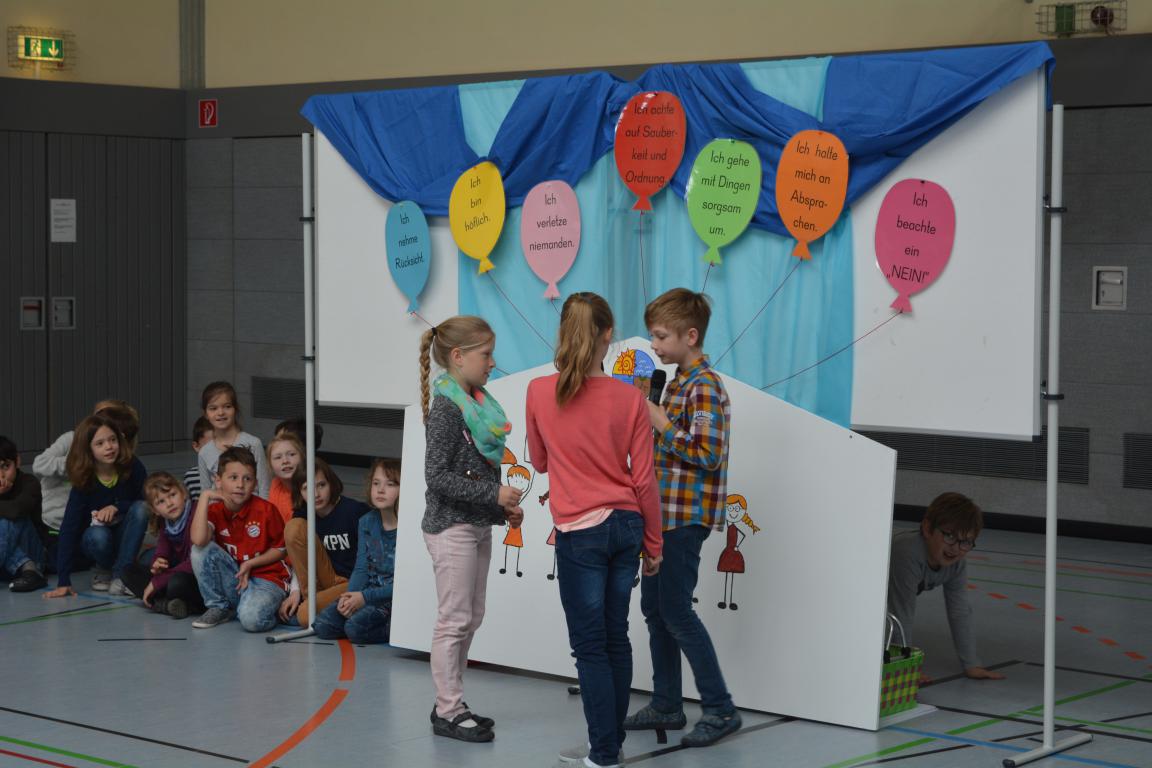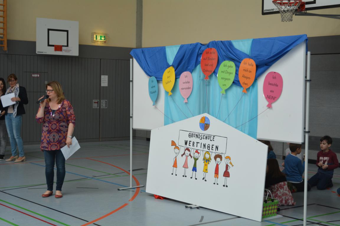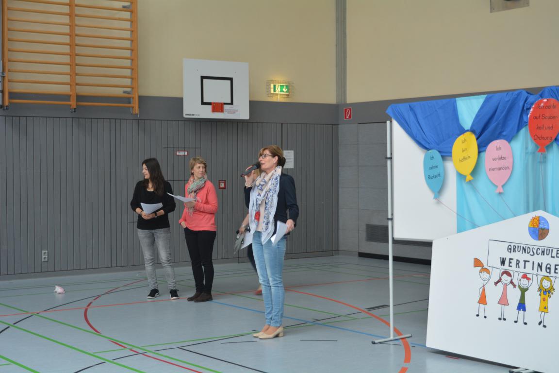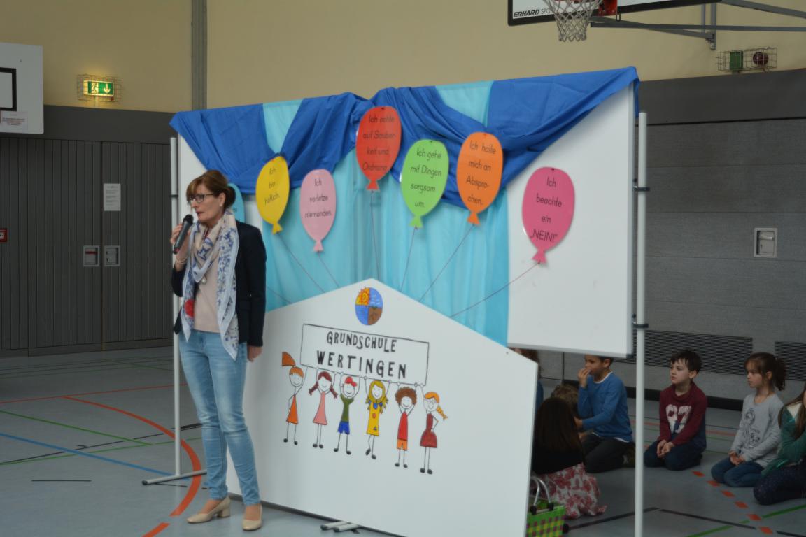 In einer „Konferenz der Klassensprecher“ wurden alle neuen Ideen mit Schulleiterin Christiane Grandé und Lehrerin Simone Motus gesammelt. Besonders gut gefiel den Kindern das Bild einer Drittklässlerin aus Gottmannshofen. Sie regte an, die neuen Schulregeln in Luftballons zu schreiben, die dann unsere Schule, also unsere Gemeinschaft, tragen sollen. Mit all den Anregungen, Ideen und Ratschlägen im Gepäck tagte das Team Hausordnung, bestehend aus den Lehrerinnen Astrid Wurm, Sibylle Kapfer und Simone Motus, um dann der Lehrerkonferenz die neue Hausordnung zu präsentieren. In einem kleinen Festakt wurde sie der gesamten Schülerschaft von den Kindern der Klassen 1b, 3b und 3d mit ihren Lehrerinnen in Form von Liedern, Rollenspielen und dem neuen Wertinger Schulgedicht präsentiert. Schulleiterin Christiane Grandé führte durch das Programm und überreichte am Ende der Veranstaltung allen Klassen ein Plakat mit der neuen Hausordnung zusammen mit einer Tüte Luftballons als kleine Gedächtnisstütze.