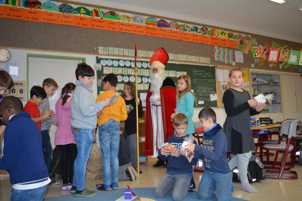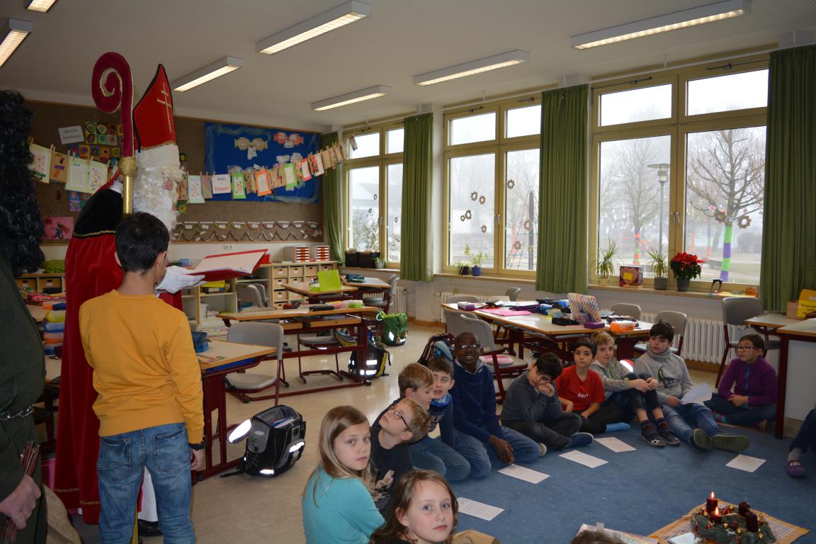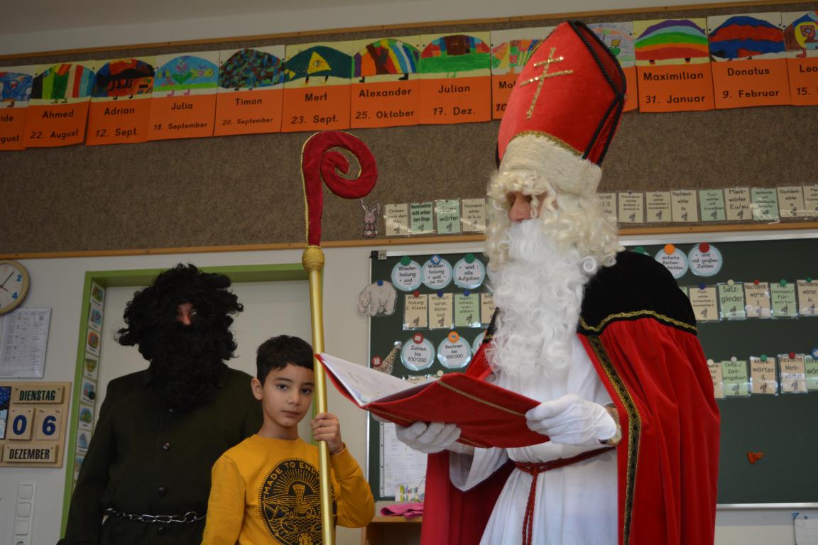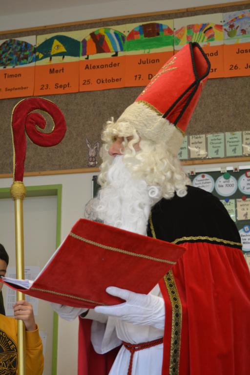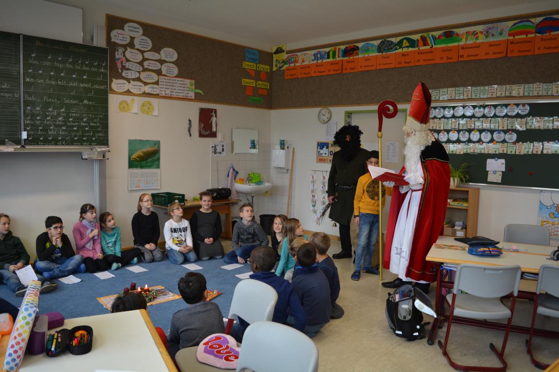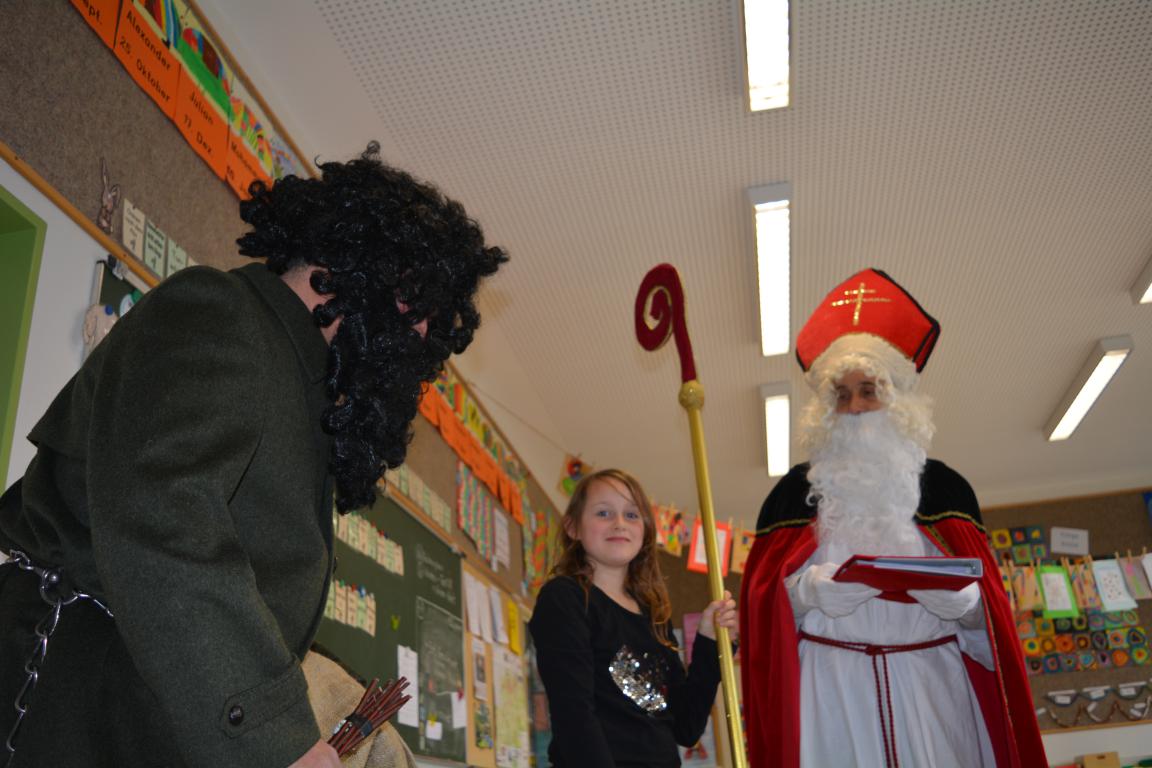 Plötzlich war nach der Pause ein Klopfen an der Tür zu hören. Nach dem "Herein" öffnete sich die Tür - herein kamen der Nikolaus und sein Knecht Ruprecht mit der Rute. Die Kinder sangen ein Nikolaus-Lied vor. Er begrüßte die Kinder und wusste aus seinem Buch allerhand über die gesamte Klasse, die Jungs und die Mädchen, über die 3. Klässler und die 4. Klässler zu berichten. Lob und auch Tadel wurden verteilt. Insgesamt war er über die Klasse erfreut und belohnte mit Tütchen aus seinem Sack jedes Kind.