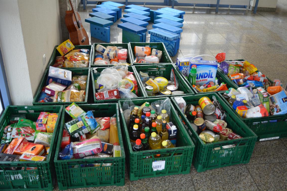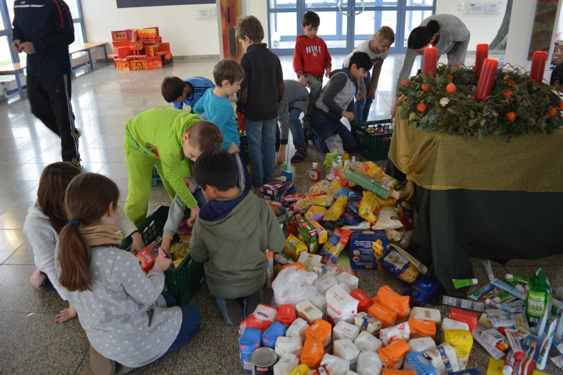 Die Mädchen und Buben hatten in wochenlanger Vorbereitung klassenweise Produkte für die Bedürftigen der Tafel gesammelt. Ein bunter Kreis an Lebensmitteln und Hygieneprodukten konnte aufgebaut und an Frau Knapp und Herrn Meier überreicht werden.