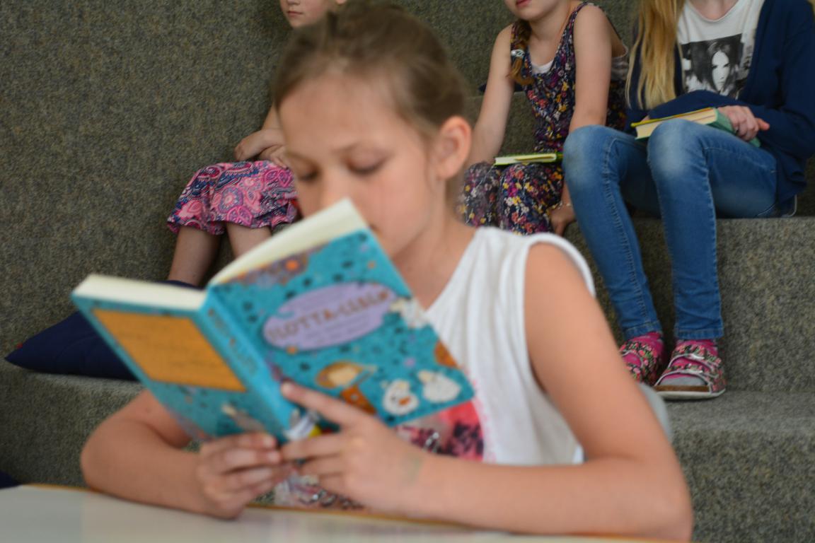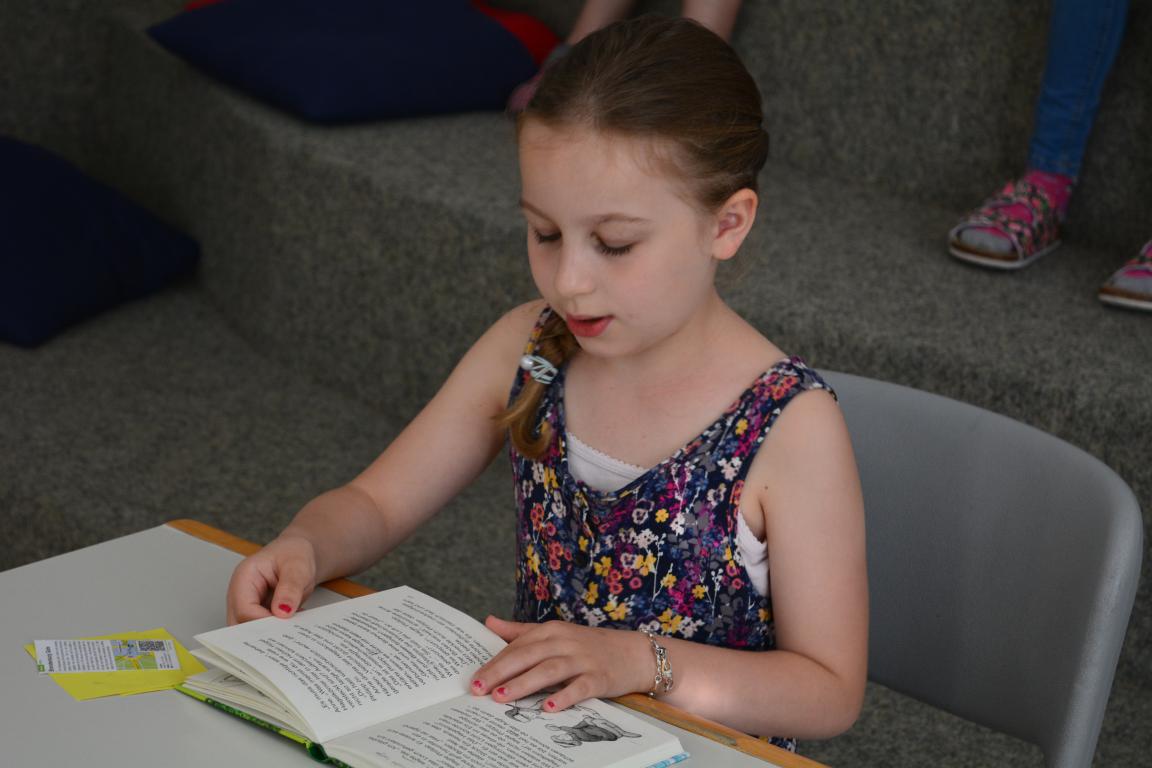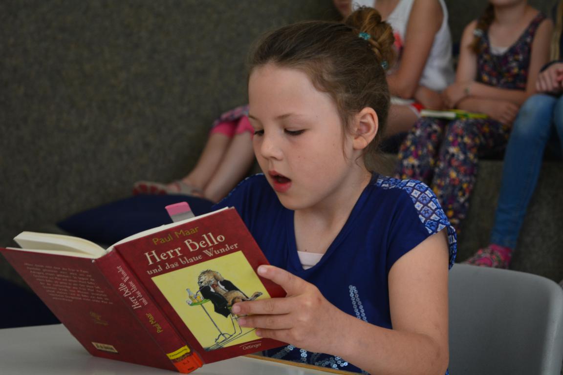 Vianne Kochems (4e) mit ihrem Buch „Herr Bello und das blaue Wunder“ von Paul Maar.