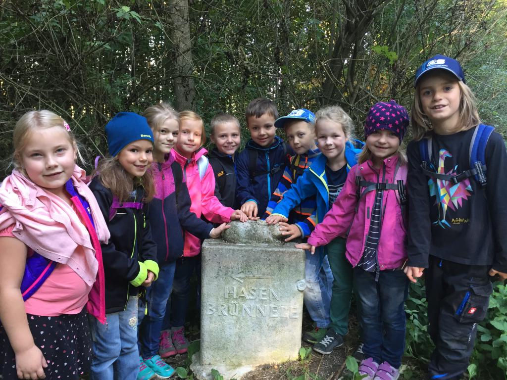 Bei schönstem Herbstwetter wanderten die Klasse 1b und 2b zum idyllisch gelegenen und allseits beliebten „Hasenbrünnele“.