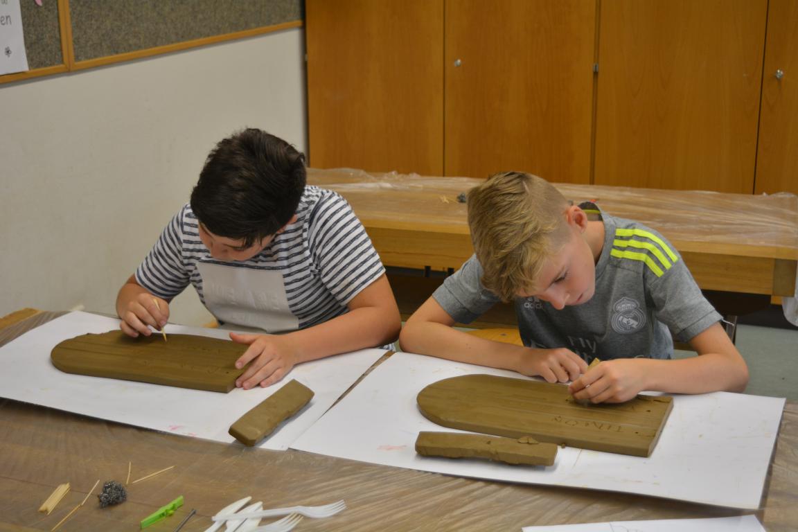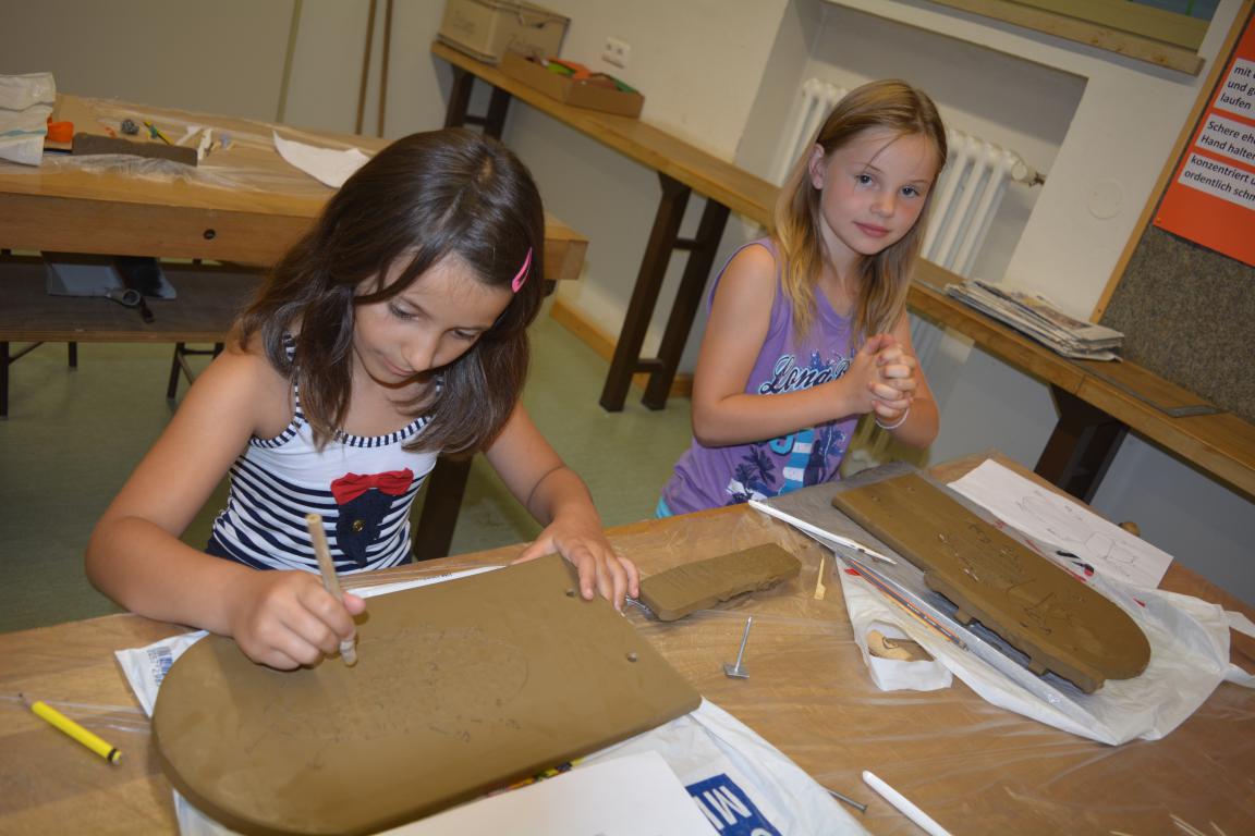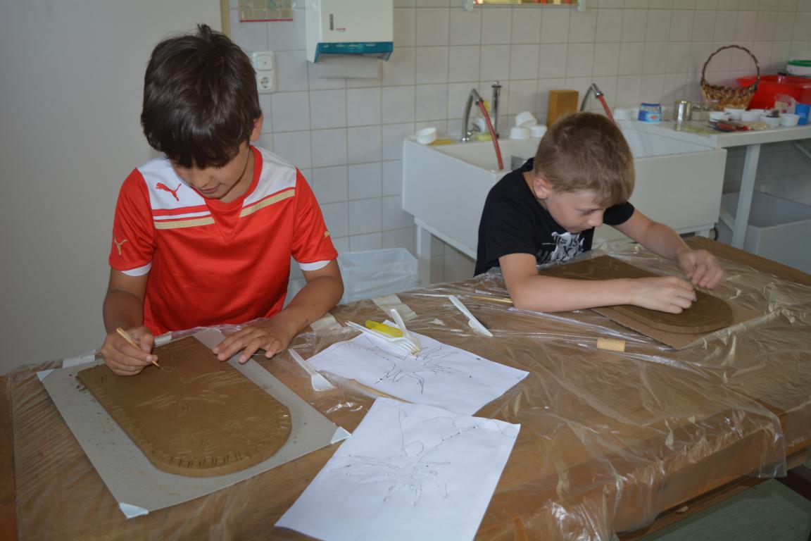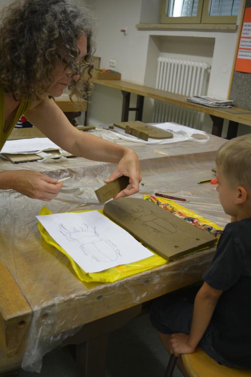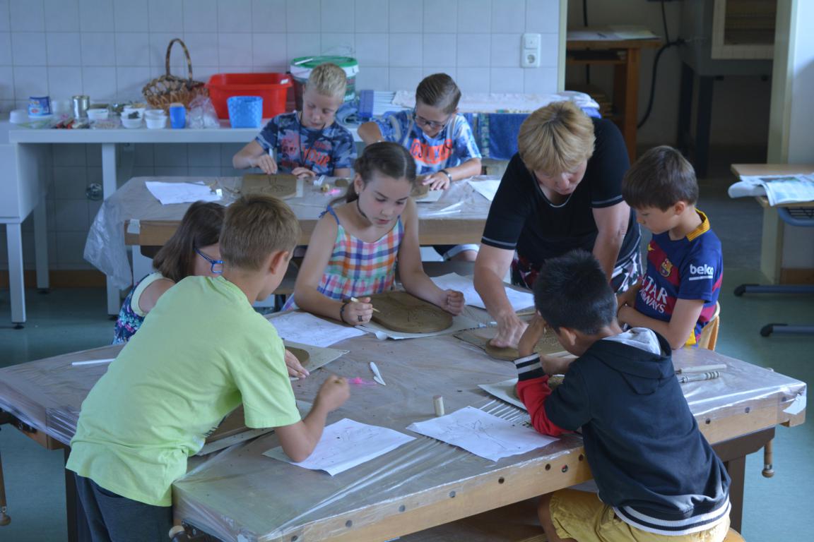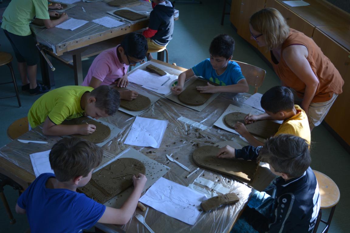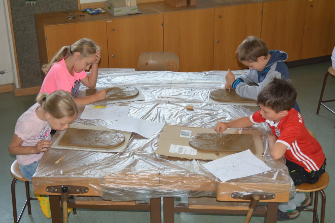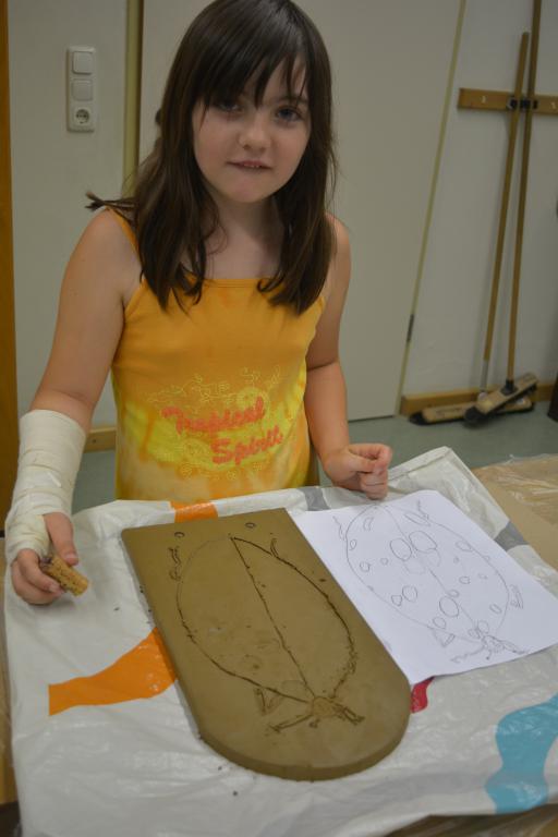 Großzügigerweise spendete die Firma Creaton für jedes Schulkind eine Tonplatte im Rohzustand. Unter Anleitung der beiden Künstlerinnen des KuKs, Barbara Mahler und Burga Endhardt, ritzten die Schülerinnen und Schüler ihre Käfer, Wiesen, Bäume und Hausgiebel in den Ton. Mit verschiedenen Gegenständen verzierten die Kinder ihre Motive. In der Ausstellung "Unsere Heimat" im Rahmen der "DLG Kultur und Wir" werden die Werke zu sehen sein.