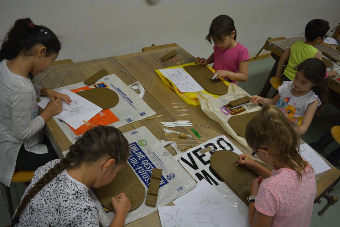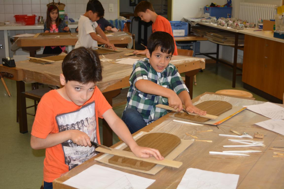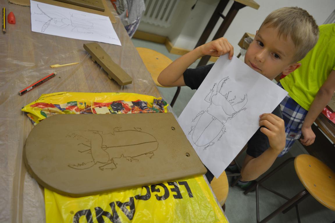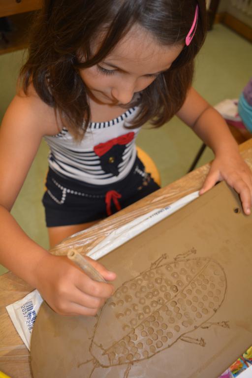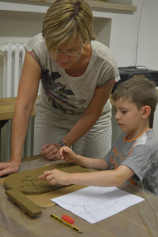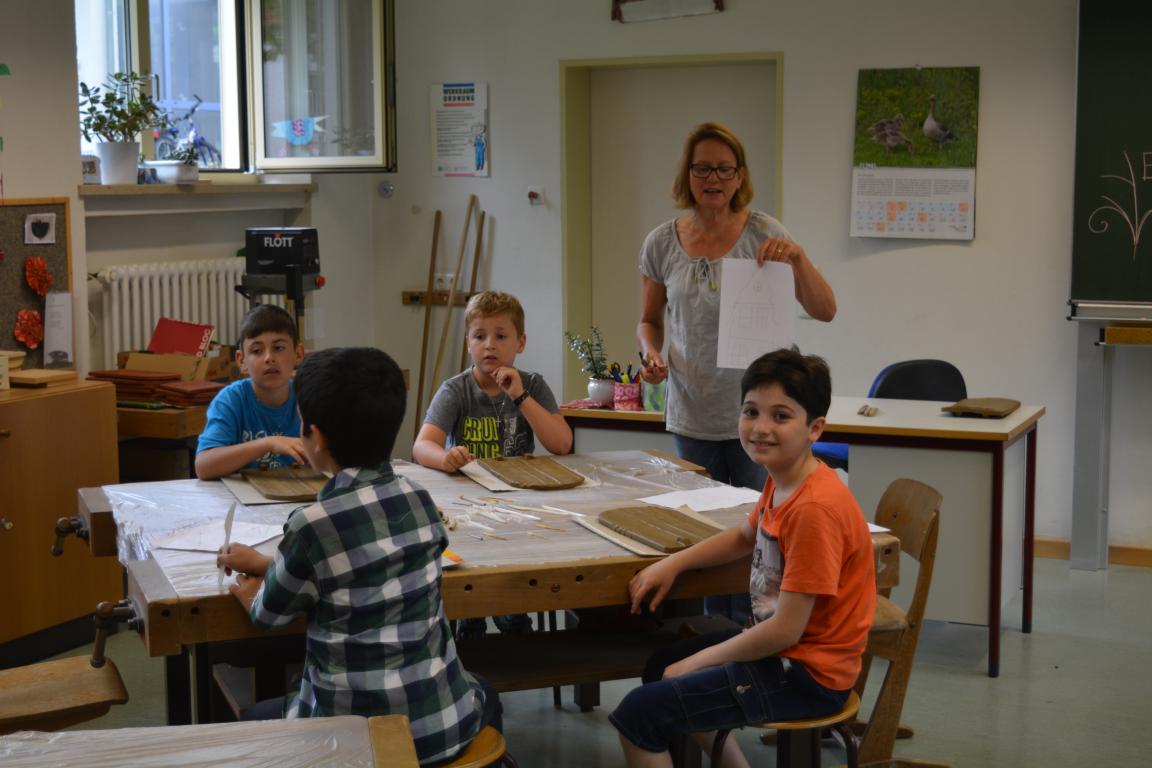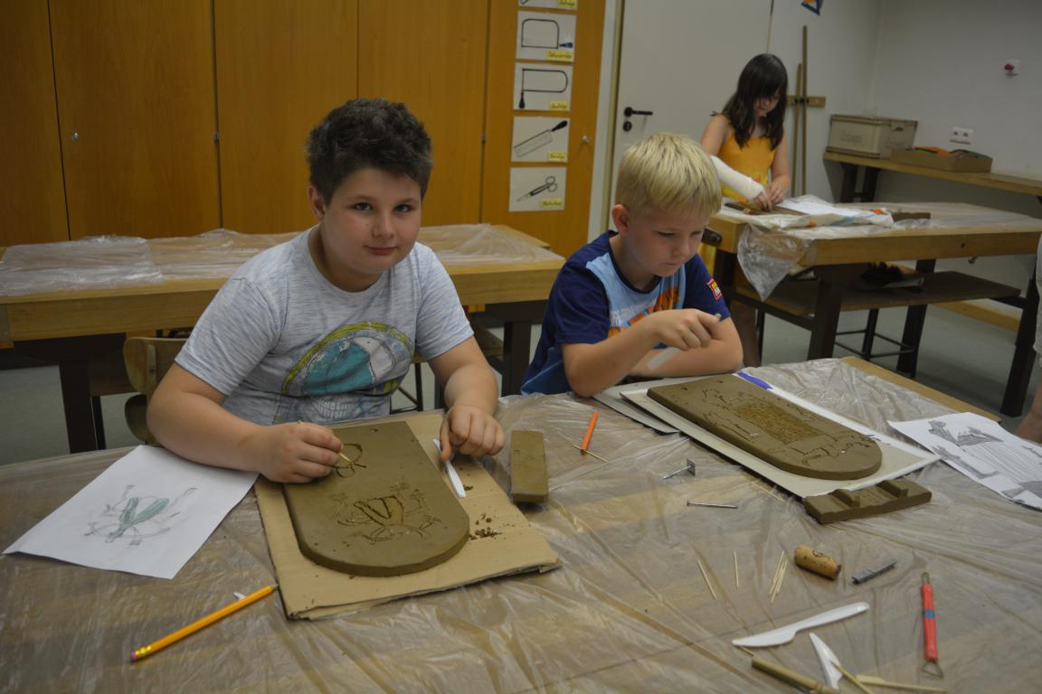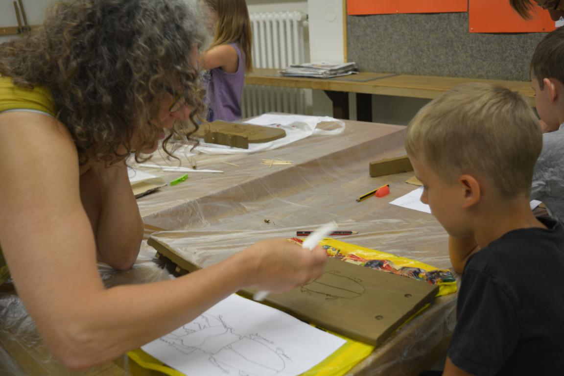 Großzügigerweise spendete die Firma Creaton für jedes Schulkind eine Tonplatte im Rohzustand. Unter Anleitung der beiden Künstlerinnen des KuKs, Barbara Mahler und Burga Endhardt, ritzten die Schülerinnen und Schüler ihre Käfer, Wiesen, Bäume und Hausgiebel in den Ton. Mit verschiedenen Gegenständen verzierten die Kinder ihre Motive. In der Ausstellung "Unsere Heimat" im Rahmen der "DLG Kultur und Wir" werden die Werke zu sehen sein.